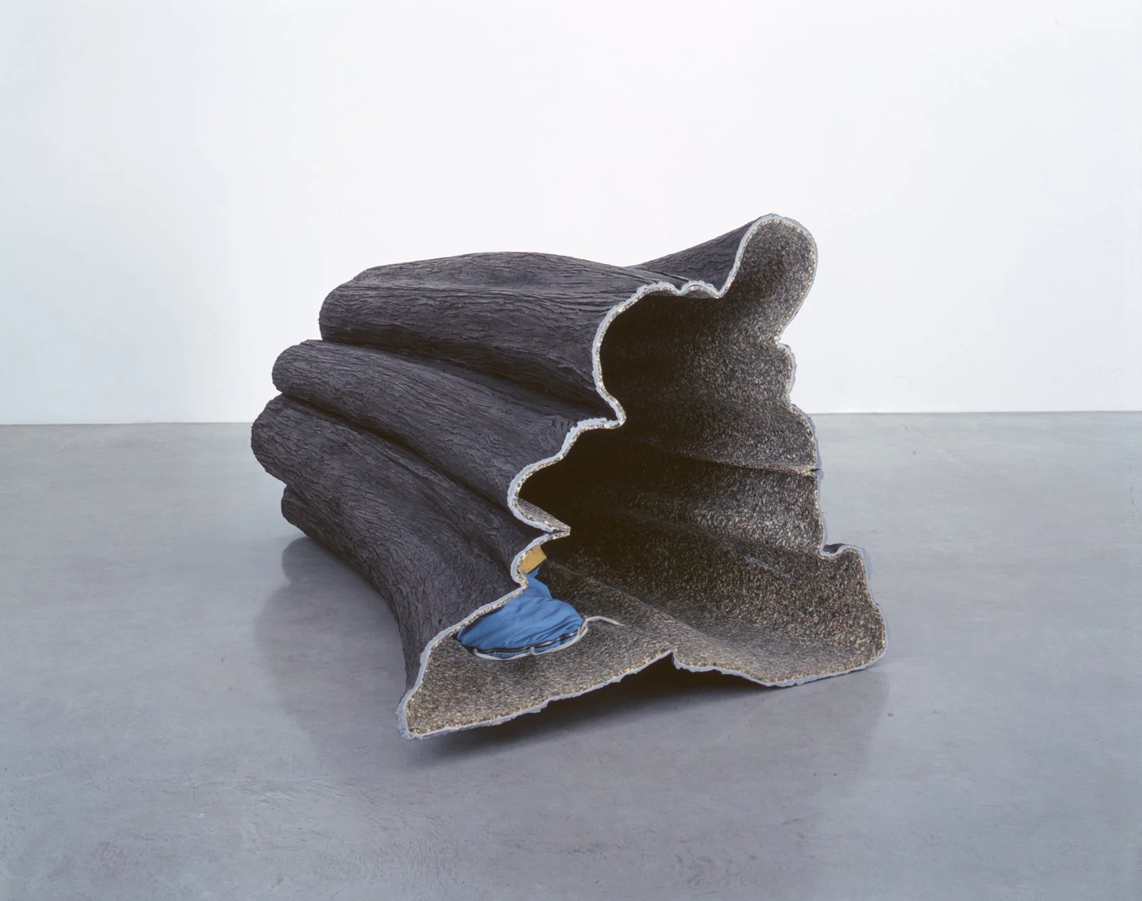 Exposed, the bare life, nonetheless, needs concealment. With no wilderness cabin to withdraw to, a fugitive must hide in plain sight, such as we find evidence of in Hollow (1998-99), a rotted out cedar stump with a sleeping bag stashed inside, except, other than the actual sleeping bag, the log has been cast in polymerized gypsum. Here detail conceals, rather than reveals.